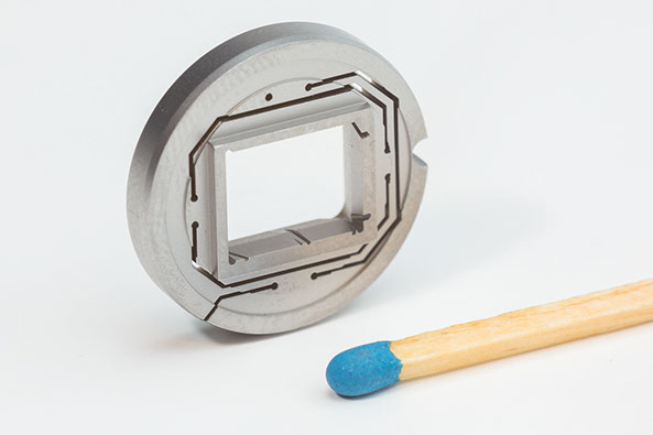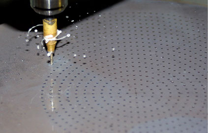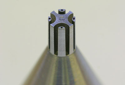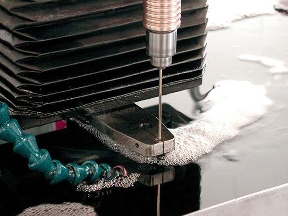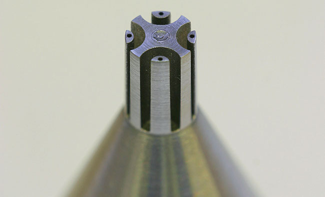 Mit dieser beeindruckenden Bohrtechnologie können wir Mikro- und Präzisionsbohrungen von 0.06 bis 3.0 mm in viele metallische Werkstoffe - selbst in Hartmetall - mit einer Positionier-genauigkeit von ± 0.003 mm erodieren.